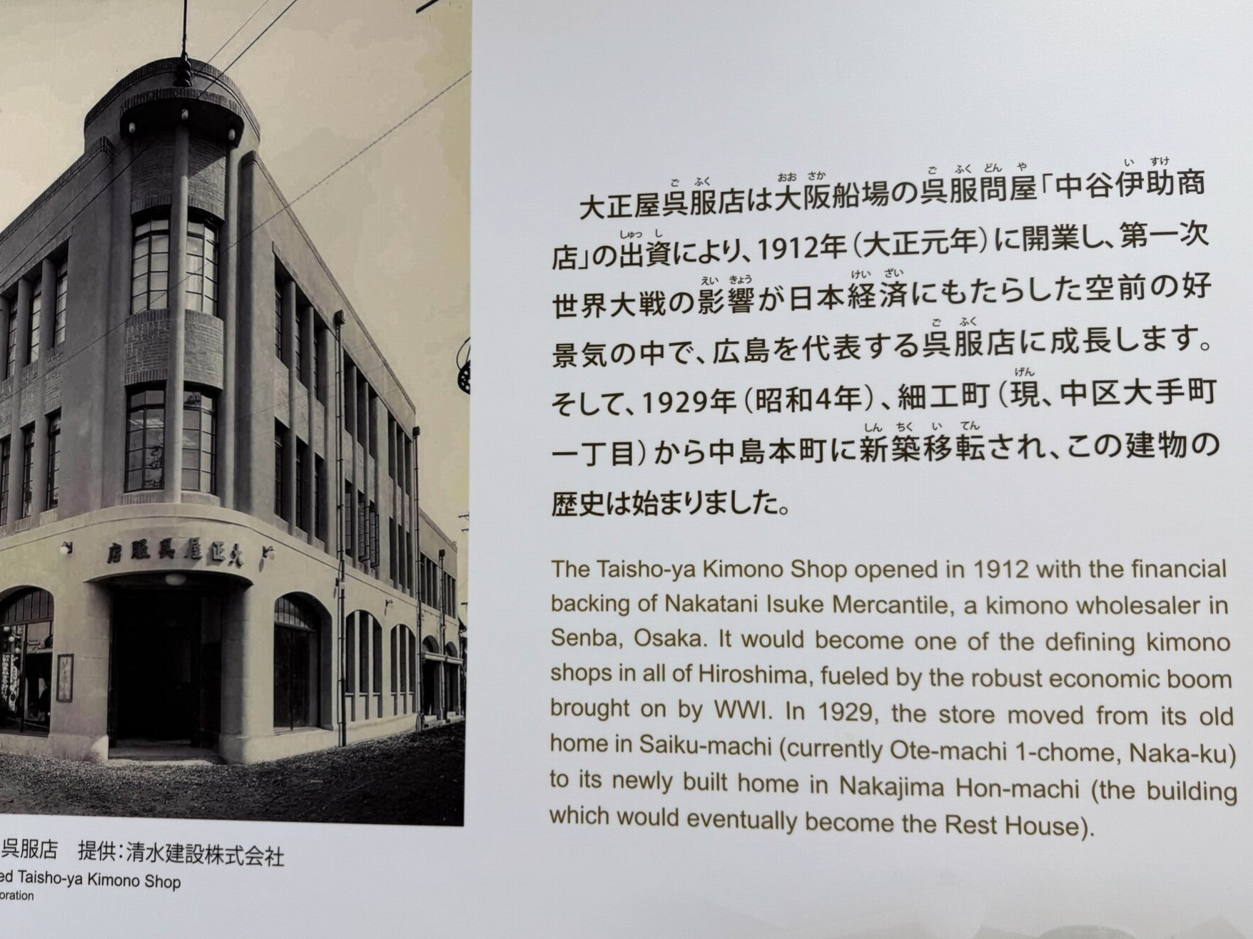 Lo que sí vimos (y al que suelen llevar los voluntarios durante el tour) es el edificio que era una tienda de kimonos, hoy conocida como la Casa de Descanso del Parque Memorial de la Paz de Hiroshima. Está dentro del parque, entre el puente y la Cúpula, por lo que es muy probable que lo veas al recorrer la zona. El edificio tiene varias plantas con distintos usos: imágenes, videos, cafetería, información turística y una pequeña tienda. Pero lo más importante está en el subsuelo. Se puede bajar y ver el sótano, que conserva el aspecto del edificio después del bombardeo.